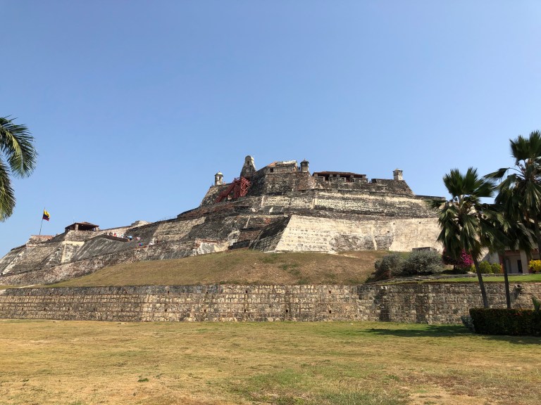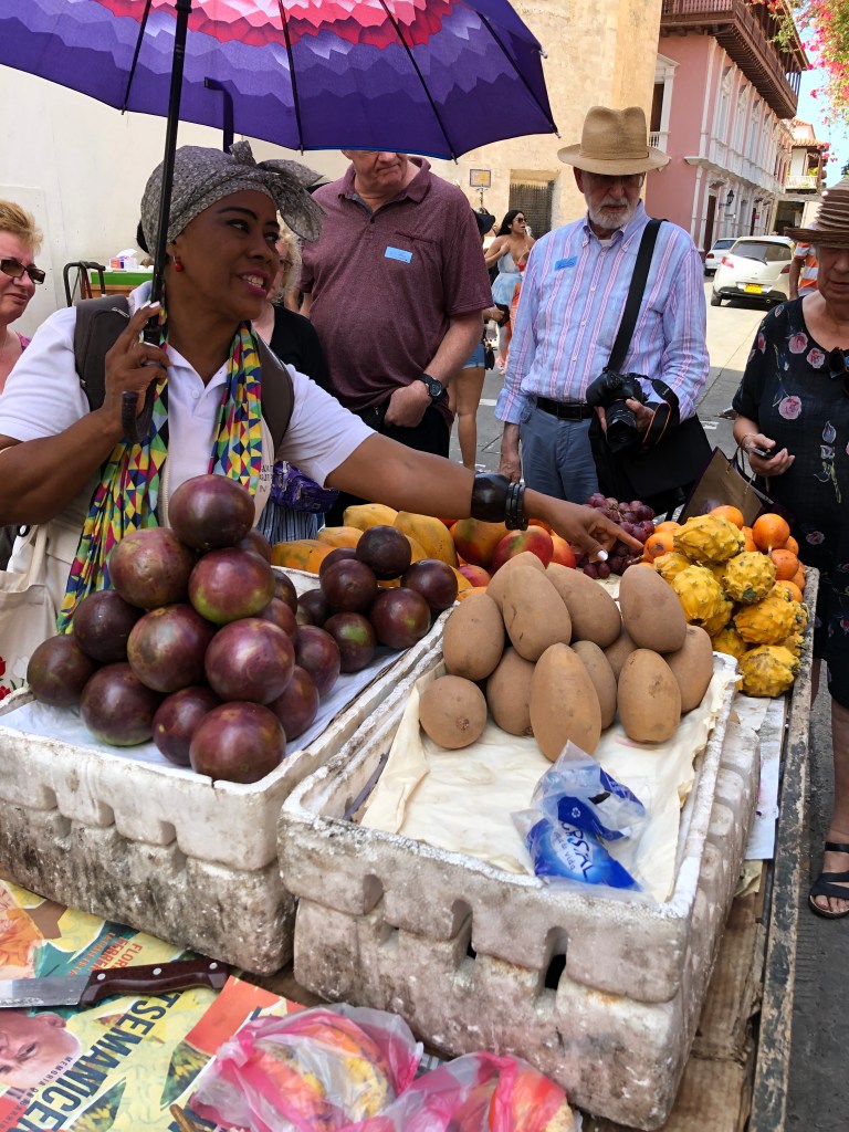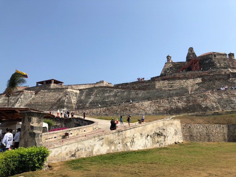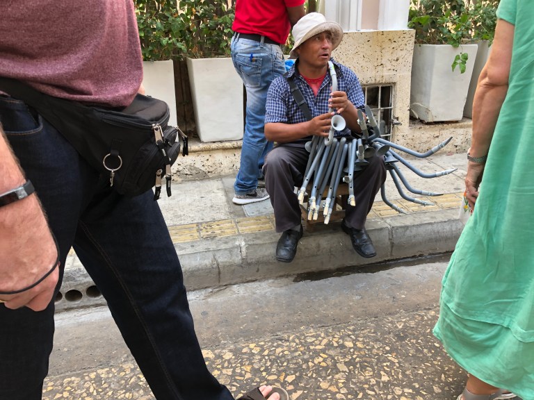 Our tour today is called Coffee experience & Sights of Cartagena. We thought this might be interesting as we were here in 2012. What a difference 7 years can make! The city has been cleaned up, no signs of military with guns and trash is gone. The street vendors are everywhere as you would expect. First stop is Castillo San Felipe – the old fort that protected the city. Last time we walked up the ramp, this time, just some pictures. Yep, Panama hats for sale.