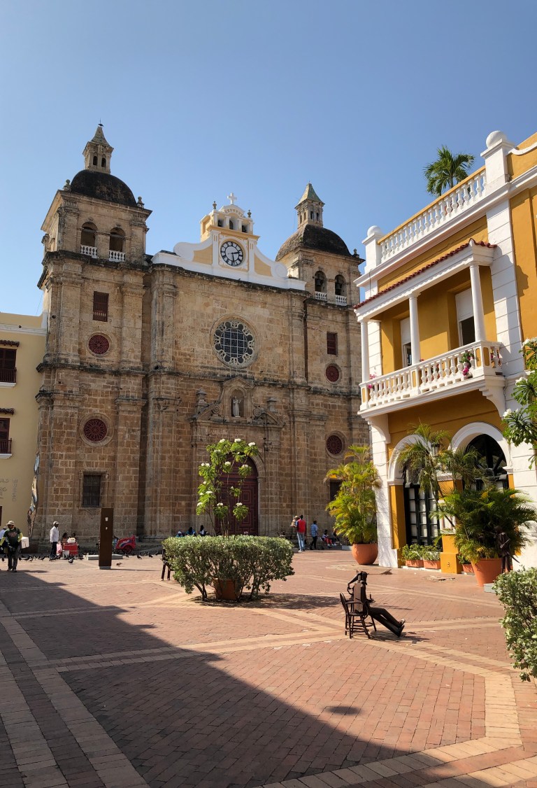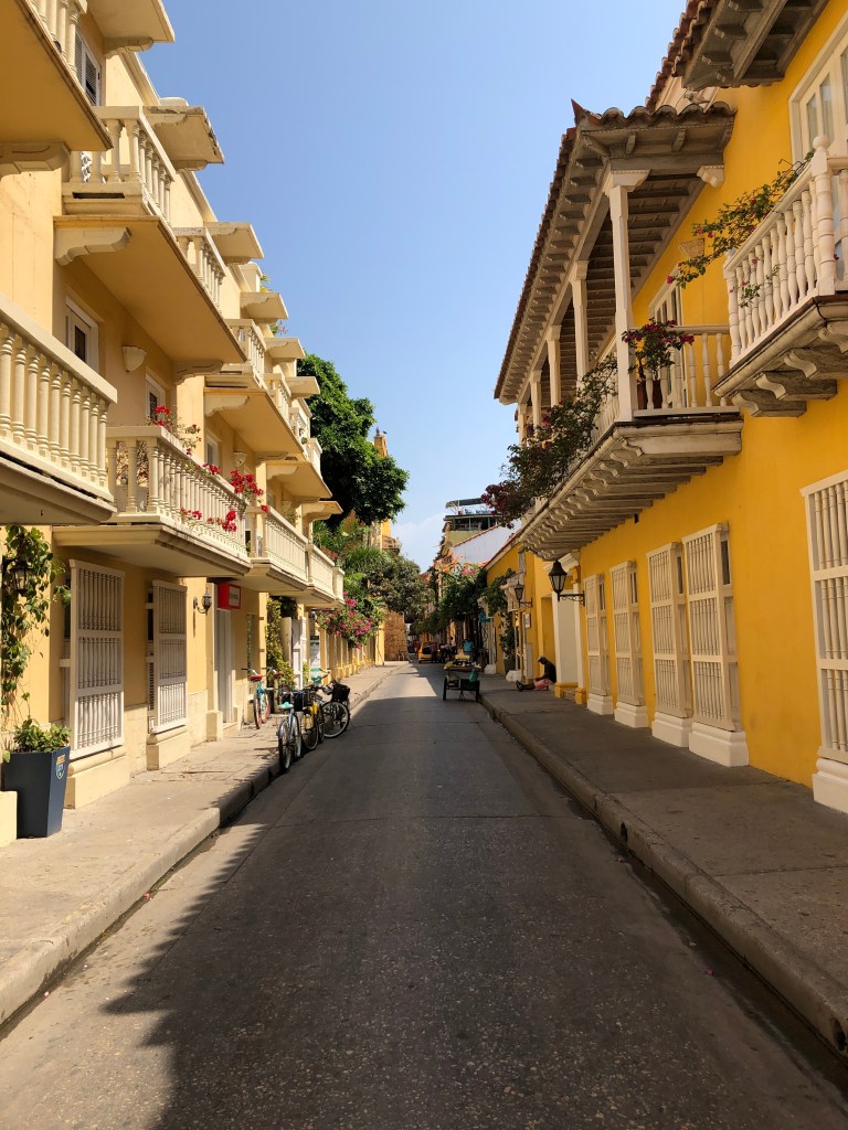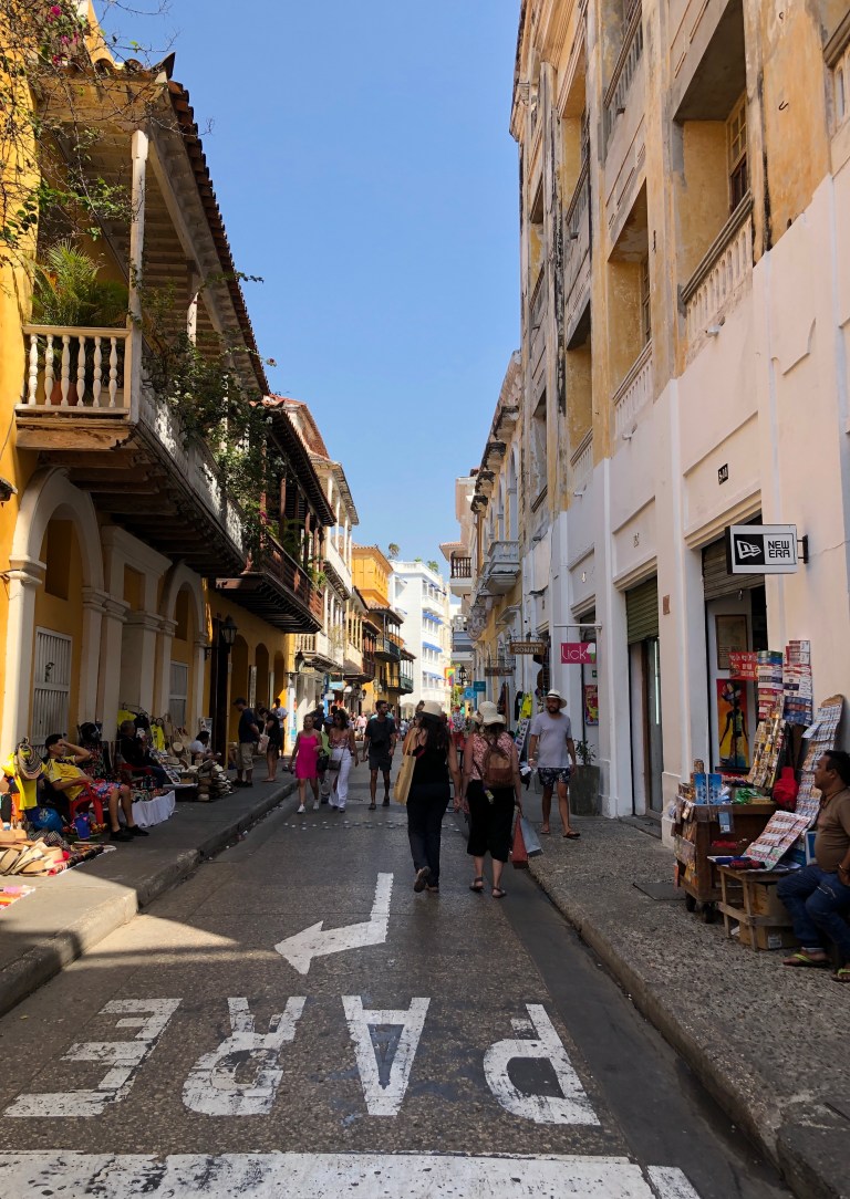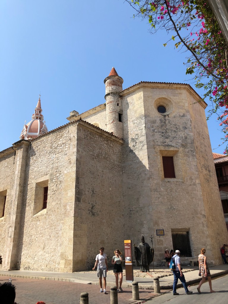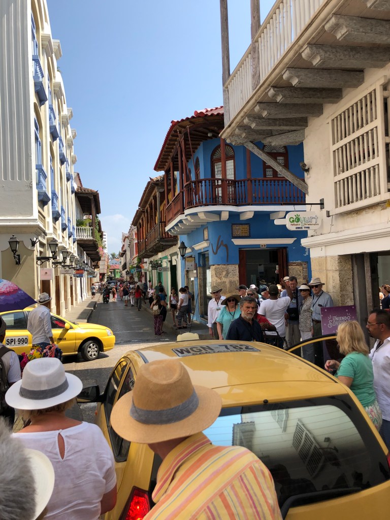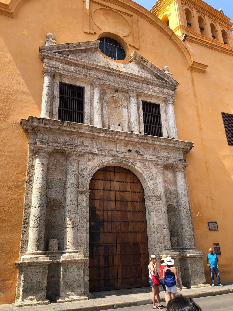 The bus enters the old walled city which is now a UNESCO world heritage site. 9 kilometers of the wall are still around this section of Cartagena. The first building below was a convent and is now part of the university. More pictures of typical street scenes and architecture – lots of large wooden doorways.