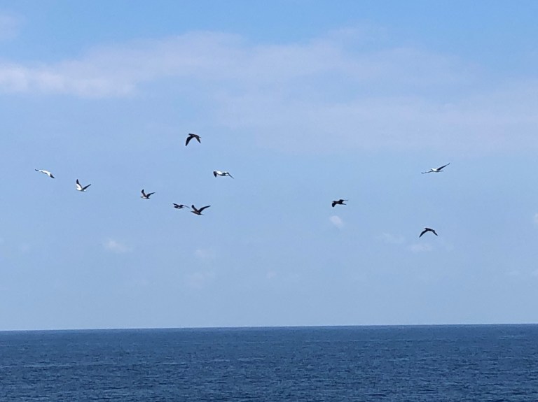 The seas are quite calm. A usual wind that comes over the mountains between Guatemala and Mexico is quiet so we sail smoothly through the waters. Birds are flying back and forth and alongside the ship. The Captain tells us these are Brown Boobies circulating the ship (yes, they are mostly white), common in these waters.