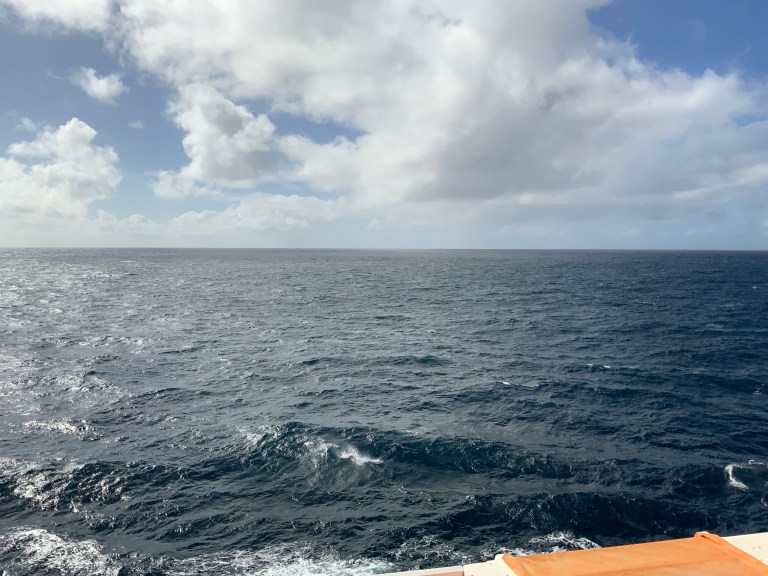 As the ship sails through the waters towards San Francisco, we pass Los Angeles on our starboard side, 110 miles away, just past Noon. The waters aren’t as deep here as they were further south – only 450 meters. The seas are rolling with swells of 15 feet.
