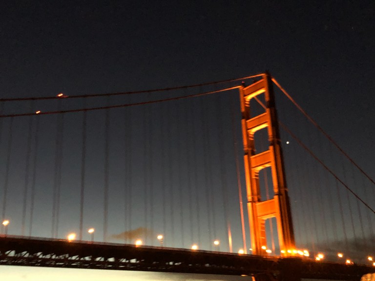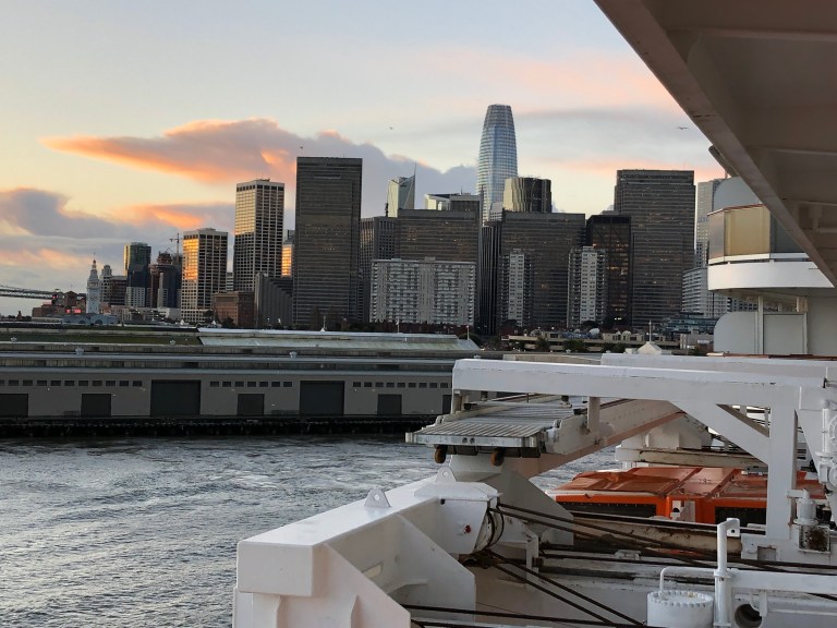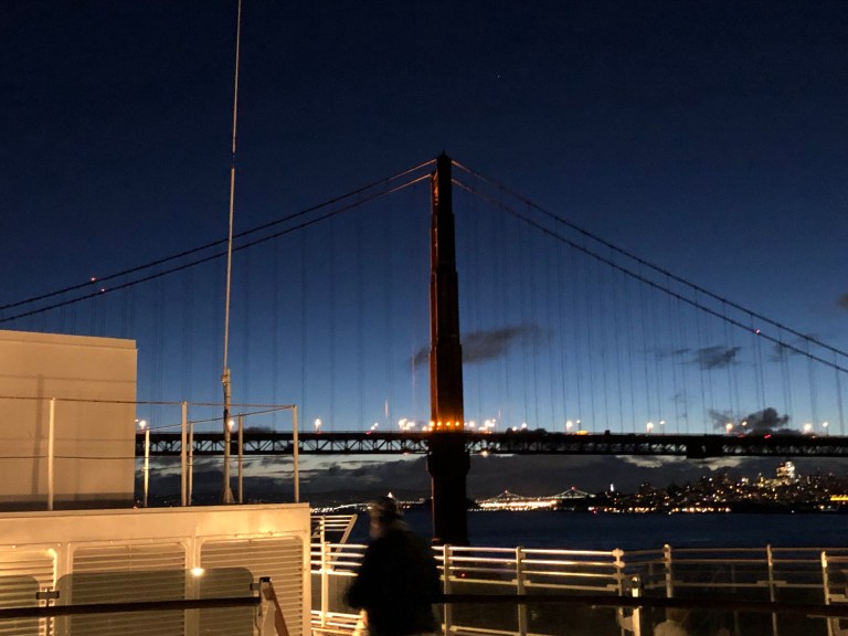 Early morning arrival into San Francisco Bay causes everyone to go up onto the top deck to get a picture of the ship going under the Golden Gate Bridge.