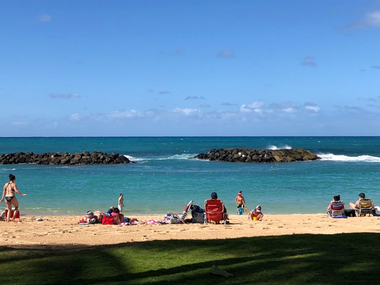 What a crazy night of travel to get to Oahu. A major storm from the Northwest caused almost 50 mph winds on Oahu and believe me – 20 feet at least waves all night. What a ride! As we arrive alive in the morning, a rainbow.