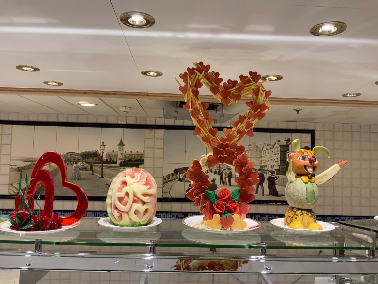 We will also be crossing the International Date Line later today. The Captain said he made the decision to not skip Valentine’s Day for those who wish to celebrate. Lots of activities on the ship for Valentine’s Day – starting with a requirement for Gala Evening Attire! The ship is also ‘pushing’ Godiva chocolates everywhere. Each night we receive two Godiva chocolates on our turned down bed. How’s that for a daily treat!