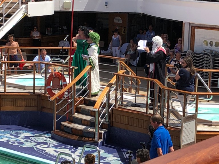 Here are a few pictures from the ceremony to recognize the “Pollywogs” crossing the Equator, a ship’s tradition for the crew. Quite a mess and very funny!