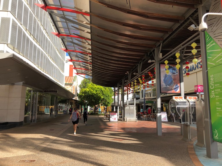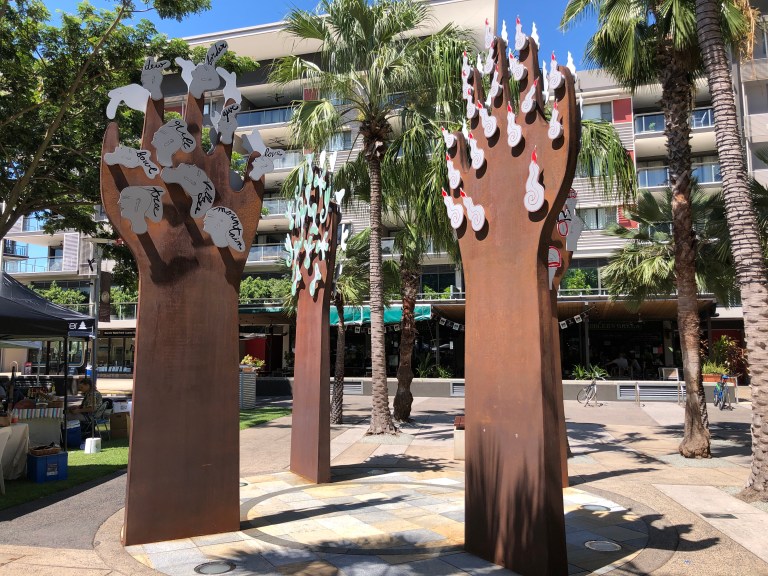 Today, we are seeking air conditioning and internet. Sitting in a food court of a mall, we still are having a hard time connecting to the City of Darwin Free wi-fi. Probably because of all the ship passengers disembarking and using the free wi-fi. I know it seems ridiculous to be on the other side of the world complaining about wi-fi. Really, it isn’t a matter of life or death – somehow we think it is. The need is only to update Steve’s computer. Downtown is The Mall – a pedestrian area with stores, galleries and coffee shops.
