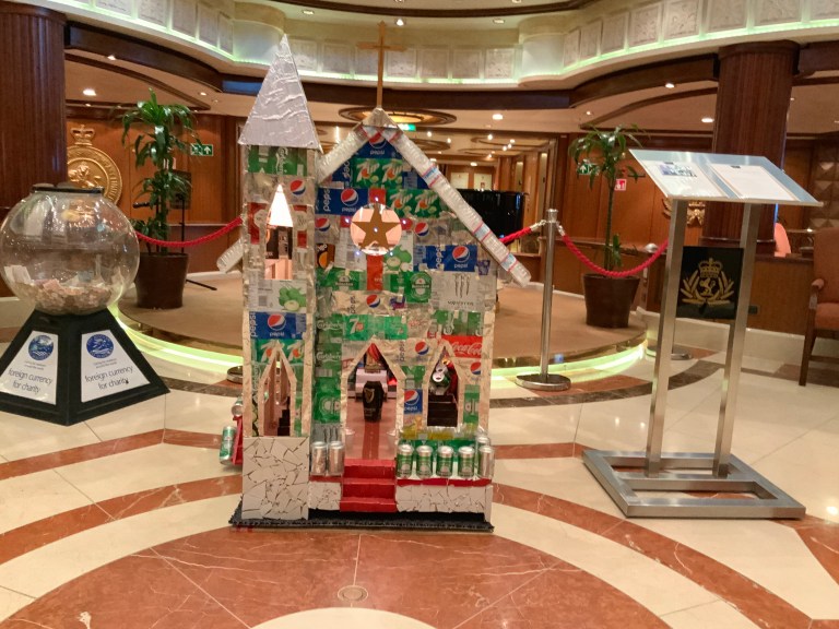 - Next stop was Environmental – aka recycling. Although they are also responsible for all environment compliance in all jurisdictions across the world – including California which had a special mention. For example, where does poop go? Where does sludge go? Where does the water go that gets desalinated – I could go on. Look at the picture below that shows a creative recycling display this department created to compete amongst all Carnival affiliate ships.