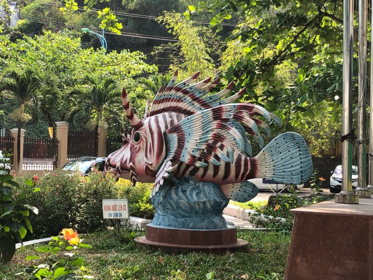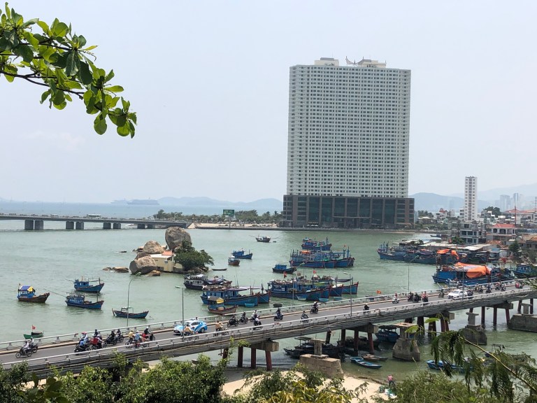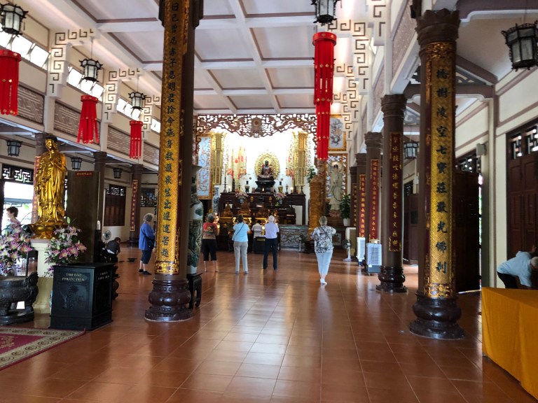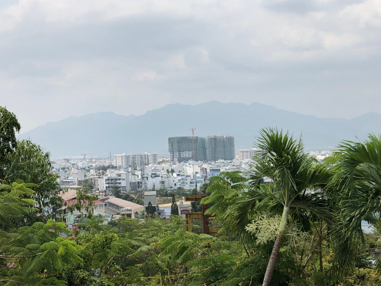 While Saigon aka Ho Chi Minh City was on commercialized steroids with it’s 10 million people, Nha Trang is under 1 million people is a fishing and tourist/resort town with a 7 kilometer beach and many hotels on the road that runs in front of the beach, other islands with resorts connected by a cable car and fast boats with a background of mountains. Both cities have a haze in the air due to all the motor scooters creating pollution – apparently no EPA here. Also, another cruise ship is in town so it is very crowded at all the sights we go to. Steve didn’t feel well so off I went to snap photos.