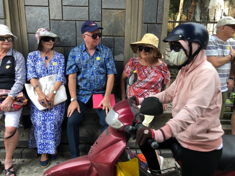 Sellers of fresh fruit. Covering up their skin – always covering up their skin. Our guide says Vietnamese are afraid of the sun. LOL