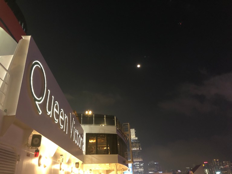 Ending our evening waiting for the Symphony of Lights Show. The skyline is stunning at night and a great way to sail away with a full moon overhead!