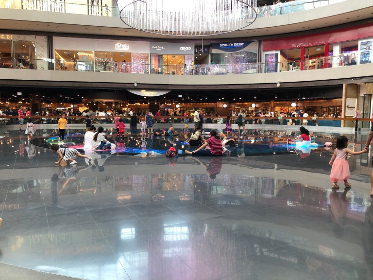 with every designer brand in the world. The atrium hanging glass and video screen is quite entertaining to watch right by the Starbucks. It cost $5 to go out on it and watch it change. Later we see people in it.
