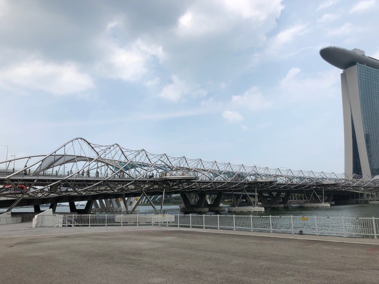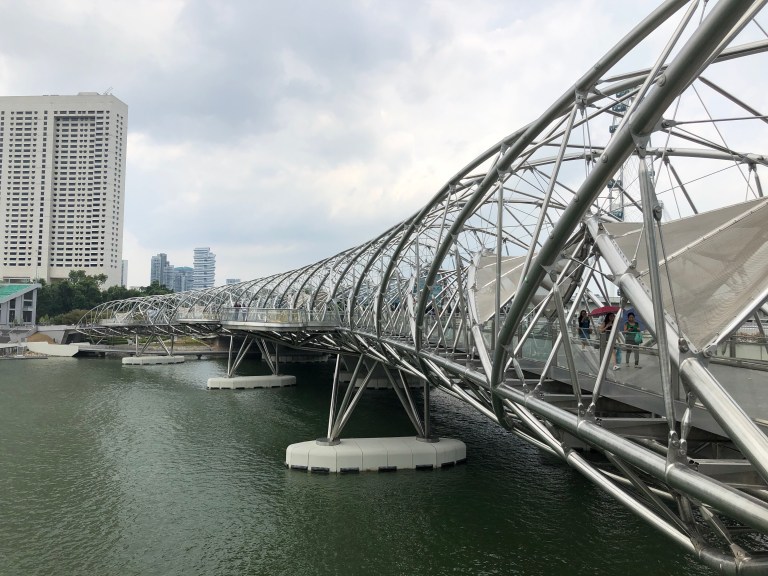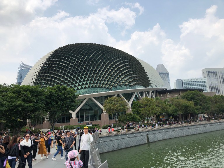 After lunch we walk over The Helix bridge and are able to capture some more pix of the Singapore skyline, Marina Sands Hotel with the shopping mall and Art & Science Museum, the Singapore Flyer Ferris Wheel (every city has to have one) and lastly walk by the Esplanade mall, crossing the footbridge to see the Singapore Merlion – the tourist symbol of Singapore. This city is very walkable and so clean. Much more to see and do and never enough time.