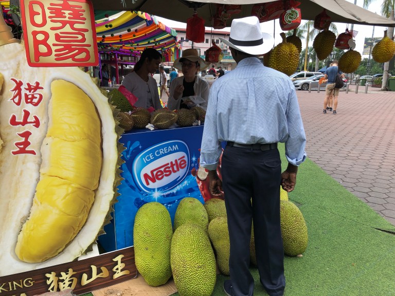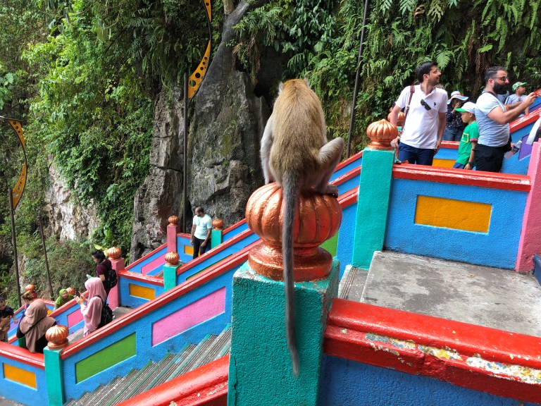 Standing at 140 ft high, the world’s tallest statue of Murugan painted with 300 liters of gold paint is outside the Batu Caves and the 272 steps you must climb to get in to the cave. Once inside there are various statues and another two temples. Pictures tell the story including monkeys and pigeons who call this cave area home.