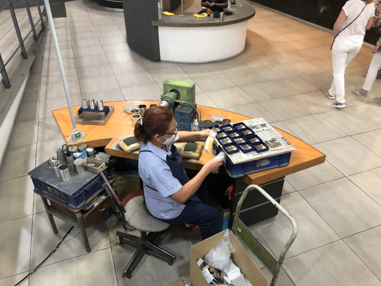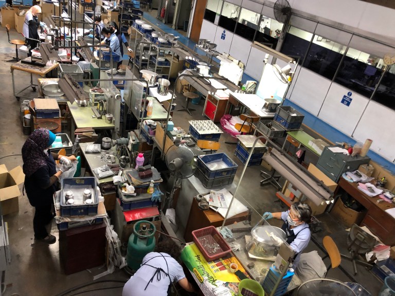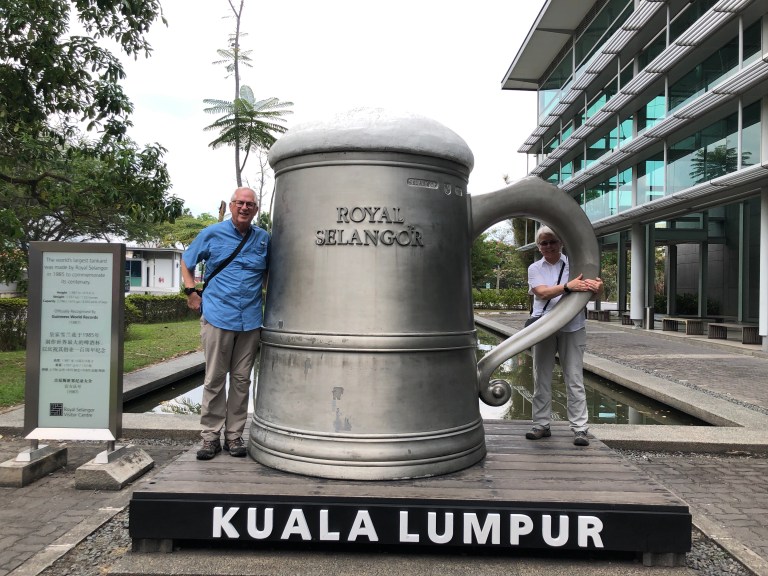 Now leaving the Hindu deities behind and going to the famous Royal Selangor pewter manufacturing factory. Malaysia was the number one tin producer in the world in the early 1900’s. A Chinese man – Yong Koon – started making pewter objects and selling them in 1858. His descendants still run the business. We are given a tour of their process and then given an opportunity to make our own in the School of Hard Knocks. Fun experience.