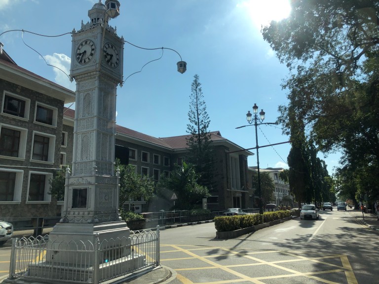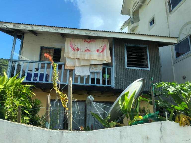 On the Main Street we see a sculpture in the middle of a traffic circle, several government buildings, and several market shops getting ready for tourist traffic. A clock tower is also a featured landmark in the downtown. The houses and buildings as we begin the climb up the side of the mountain look familiar – think Caribbean.