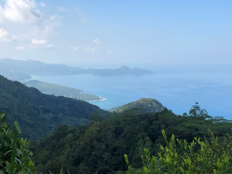 The road is very steep and the bus stops a number of times so we can get a picture. We are traveling through the Morne Seychellois National Park. Huge trees, vines and lots of foliage is the best description as our bus climbs higher and higher up the mountain. Spectacular views down to the sea.