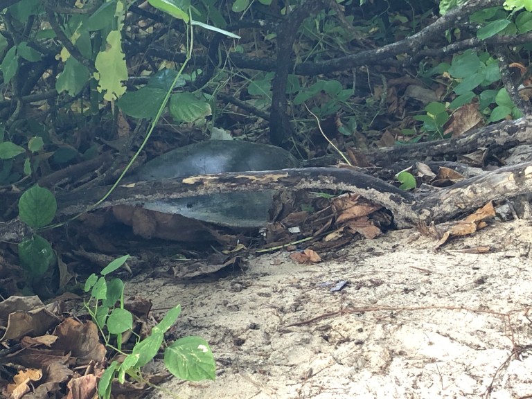 Next stop are the National Botanical Gardens. They are located down near the town of Victoria. We drive along the beach and are able to get nice pictures of the Indian Ocean lapping on the beach. And a bonus – a green turtle has just crawled ashore (see the tracks) and is huddling among the shrubs, getting ready to dig her nest and deposit her eggs. Haven’t seen this kind of live action in Florida!