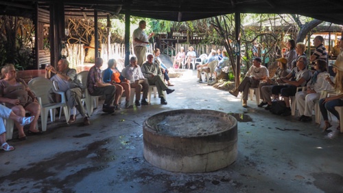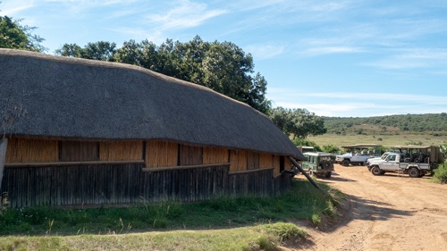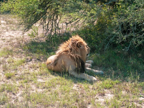 We backroad around finding animals for 2-1/2 hours in the Land Rover in the morning. Then we had a short break before we backroad around for another hour to search for lions and to see other animals that can cohabit with them. Inside a lapa (a thatched structure out in the bush), seated at tables, we are served a lunch buffet consisting of lamb stew, barbecued chicken, tasty biscuits, veggies and a dessert. And an open bar serving among other things, the local beers – Carling Black Label and Castle.