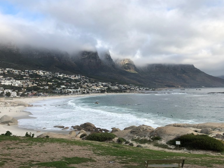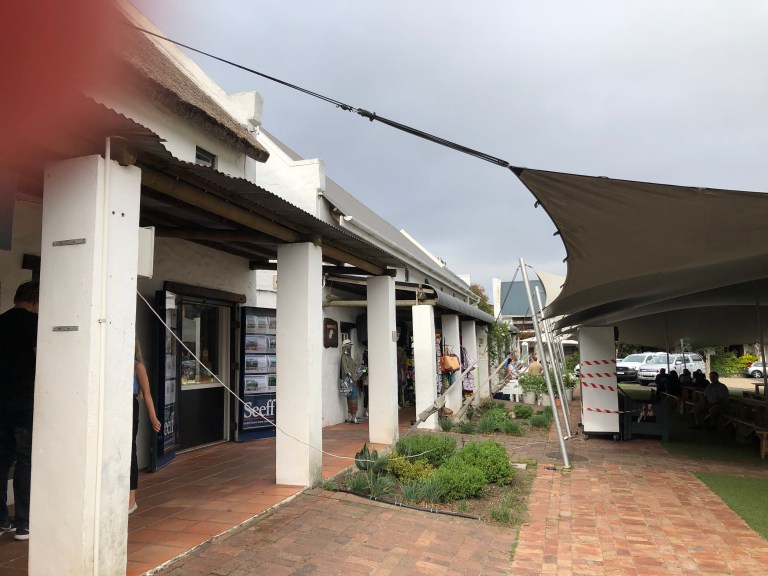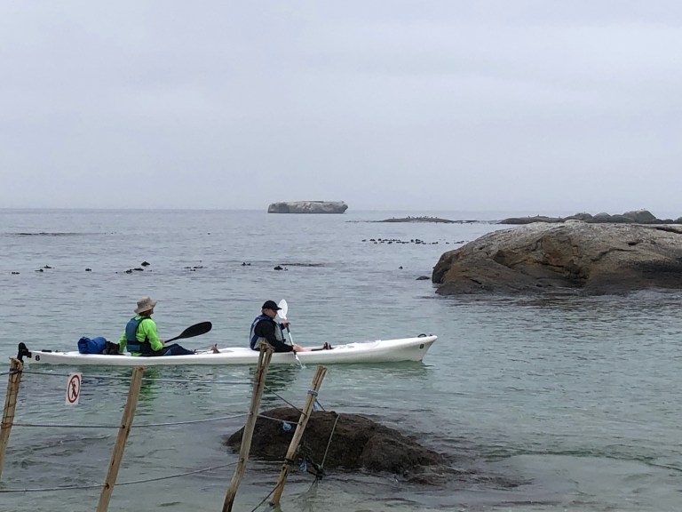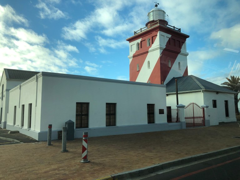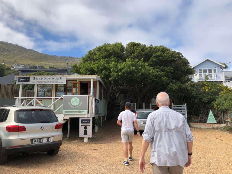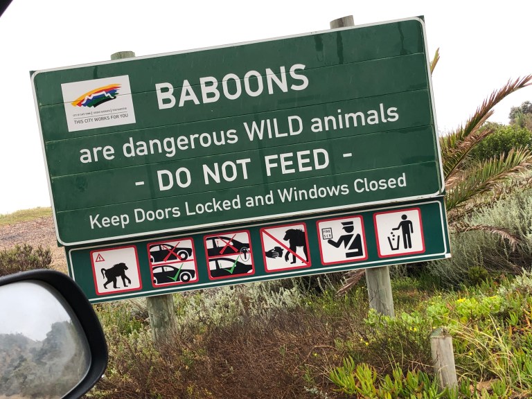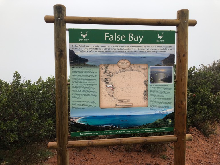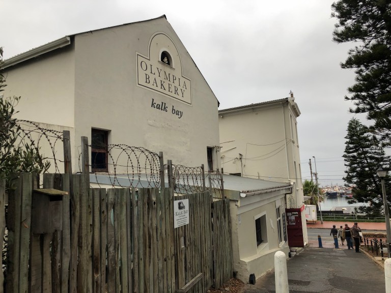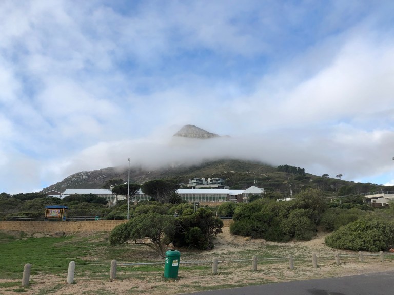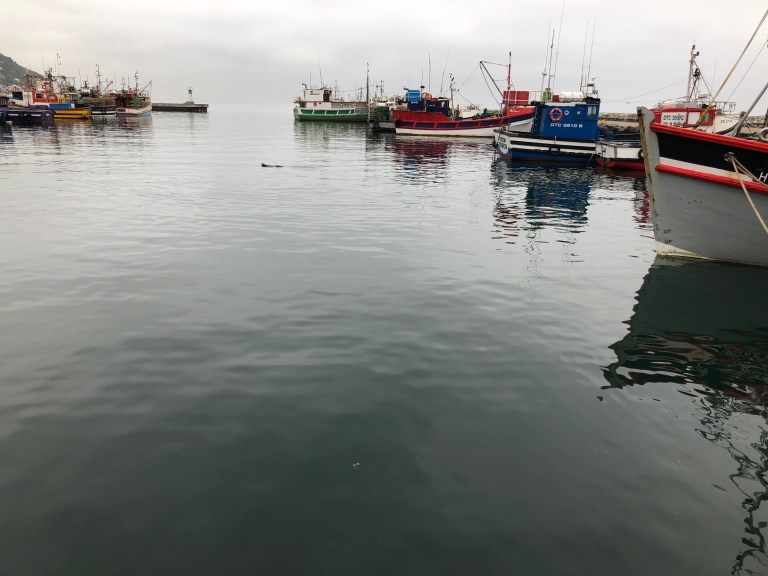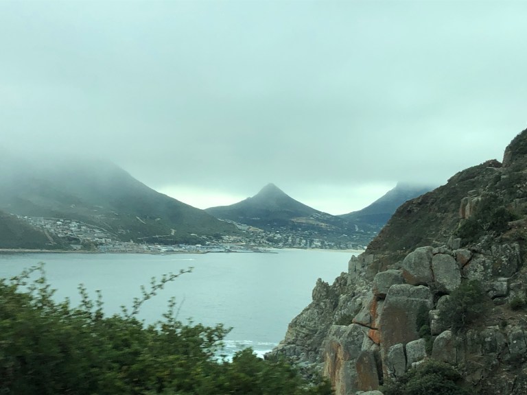 With the assistance of Admiral Travel in Sarasota, we hired a private tour guide for Day 1 and we were picked up at 8 AM. Since Table Mountain was fogged in we didn’t bother to go up. Instead, Robbie, our guide, drove down the Cape to our first stop – Kalk Bay. There is a bakery there he wanted us to experience and also the fishing boats. Delish coffee and bakery goods, such as Hot Cross Buns and a Cinnamon Stick for me. A small vineyard is next to the Bakery. The foggy, misty weather and walking along the waterfront is perfect for visiting a fishing town. There is a seal swimming in the harbor area enjoying its day.