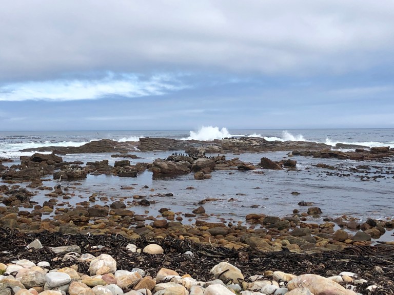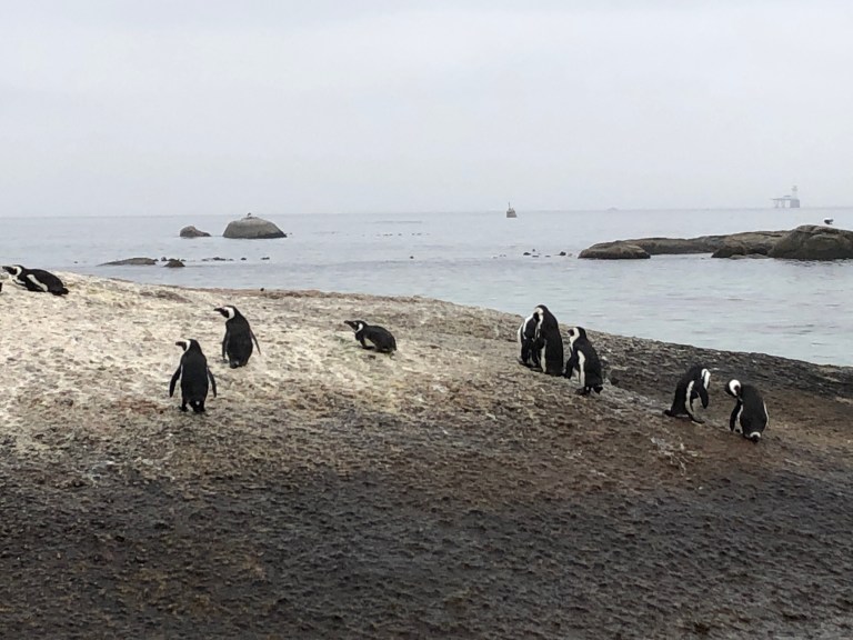 Next stop is Simon’s Town to see the Penguins. We were going to Kayak but with the mist and weather conditions, we told Robbie we’d rather visit and then continue down the Cape. John takes us down the beach to the Penguin colony and tells us all about the colony. They showed up in 1995, nest along the rocks, go off looking for food during the day and generally hang-out here. The rock offshore in the distance is called Noah for Noah’s ark – you can see why. There are seals that hang out there on Noah.