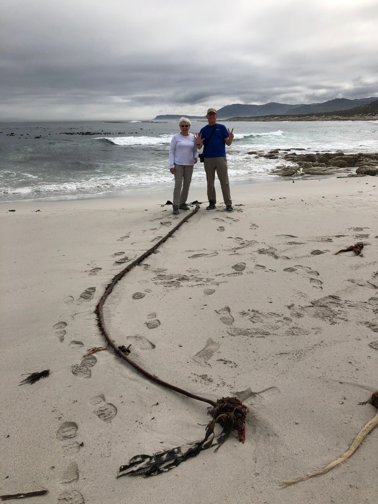 Continuing down towards Table Mountain National Park, we are lucky as Robbie drives us around to see a colony of baboons, ostriches and spring bucks. We take a short hike along the ocean area in a less visited section of the park. Spectacular sight to see! There is kelp along the beach; these plants are prevalent all along the shoreline.