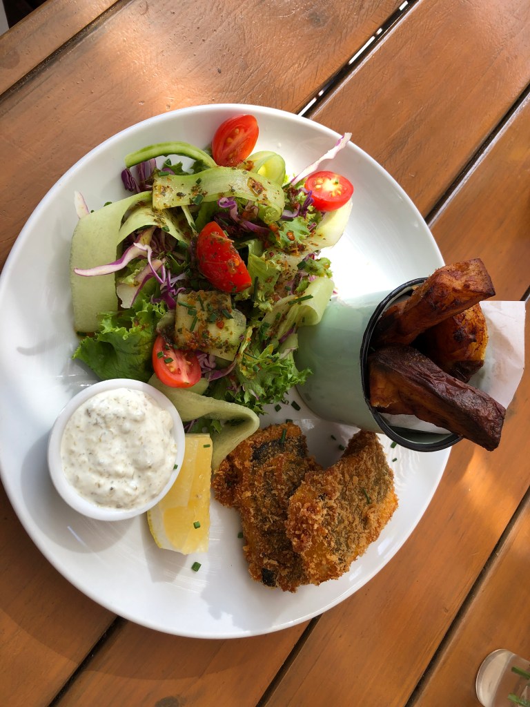 Back on the road now, Robbie drives us up the West coast of the Cape to a small town – Scarborough. We have lunch a the Whole Earth Cafe – healthy and delicious – especially Steve’s tofu-fish. Then a stop at another small town’s brewery, a [healthy] ice cream shop and small shopping area in Noordhoek before taking the Chapman’s Peak Drive.