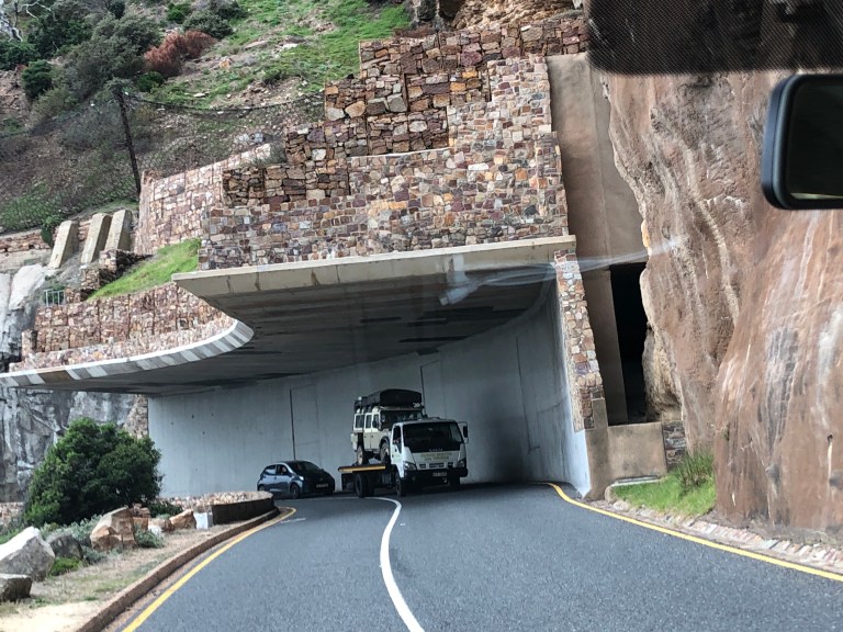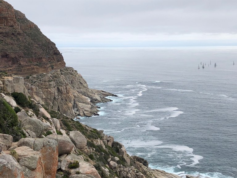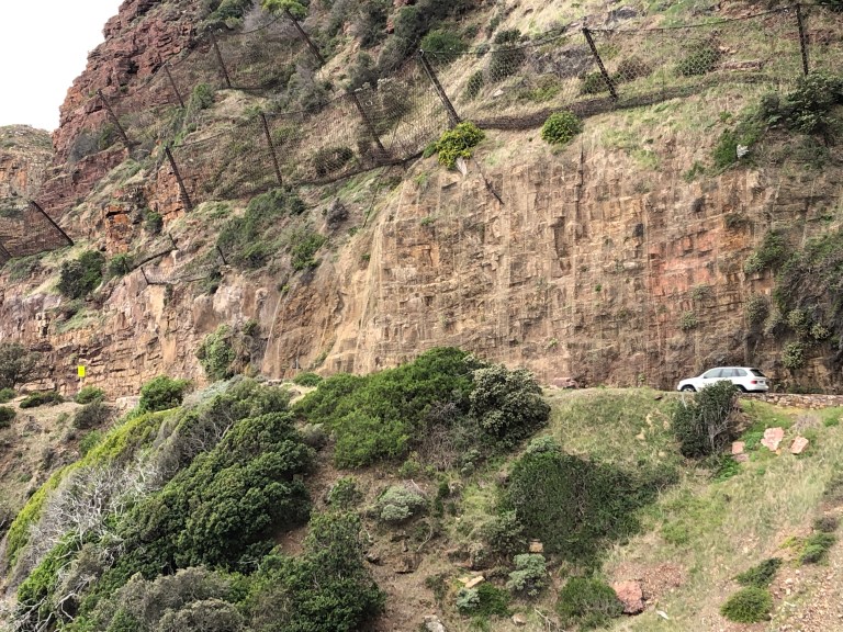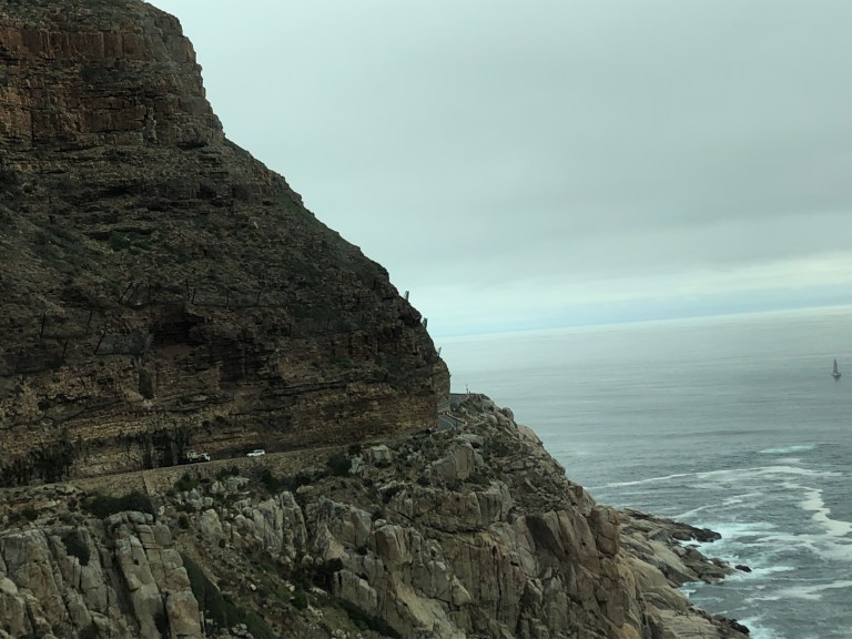 The Chapman’s Peak Drive is one of the most beautiful in the world. Winding along the cliff side with the Atlantic Ocean on one side and shear cliffs upward on the other. There are sailboats, surfers, and cyclists as we slowing drive along the road towards Hout Bay.