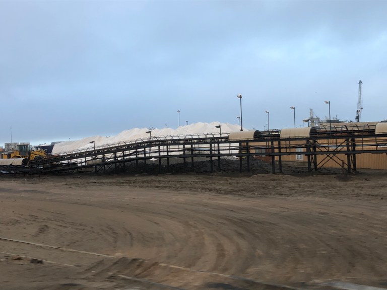 Sea salt is a major product here; Namibia provides most of South Africa’s salt and ships salt all over the world for use as a spice, in chemical plants, and on the roads of Europe. We see some in the port area.