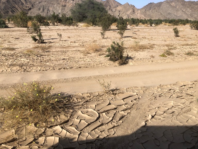 We drive through a river bed that had flowing water two months ago when the rains came and now is just cracked clay.