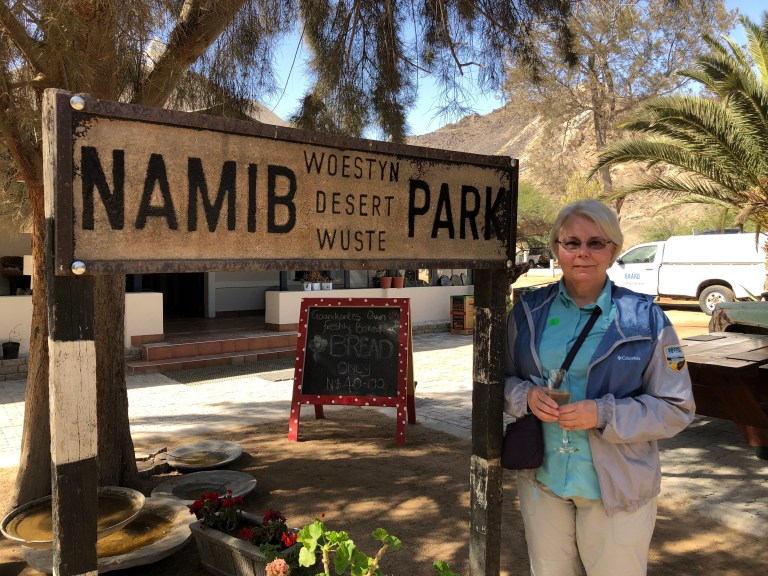 We stop in the Namib Park at an old vegetable farm called Goanikontes. Chickens and goats are wandering around the property. The owners have turned it into an “Oasis” (yay – toilets!) serving baked goods, finger food and South Africa sparking wine. There are cottages here that you can stay overnight as well. That would be something pretty spectacular, especially at night since there’s no light from civilization or particulates in the air to get in the way of star gazing.
