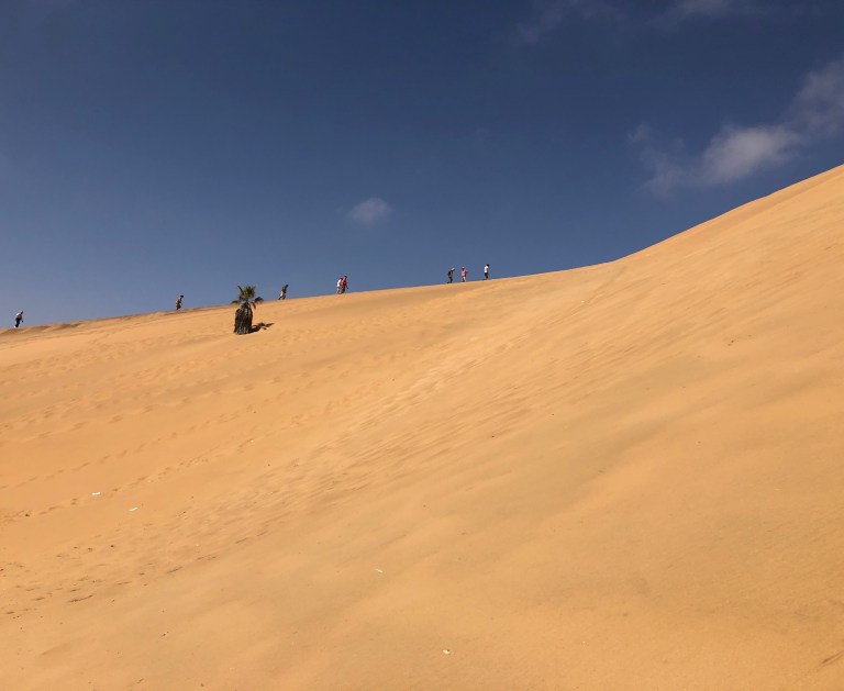 The desert is always something magical to experience. More time here would have been nice. As we drive back to the port, our driver stops at Dune 7 – the tourist dune – for ten minutes. People are climbing it to take pictures and experience it. 10 minutes isn’t enough time for us, either to take pictures or to climb. We will take on the climbing challenge this summer when we stop at the new U.S. national park – Indiana Dunes – not located in a desert but certainly more easily accessible to the public.