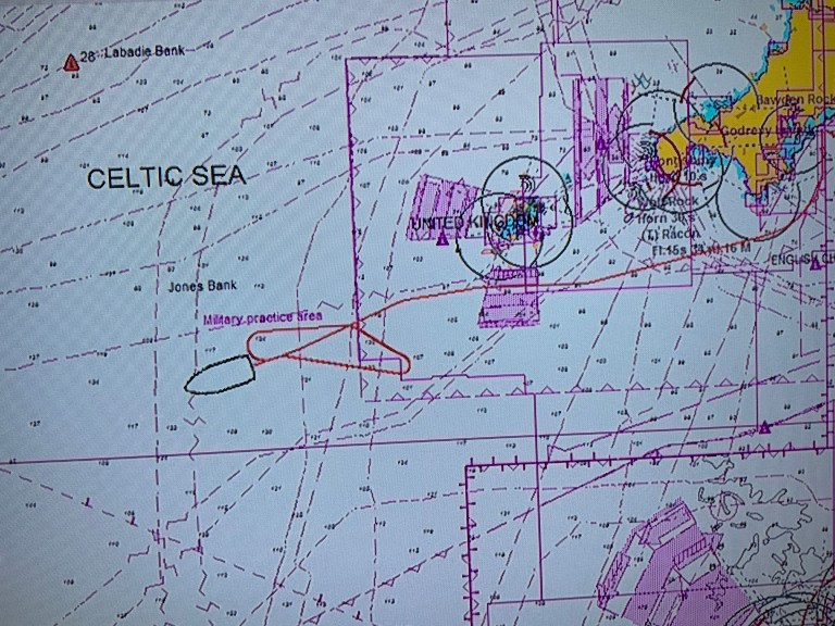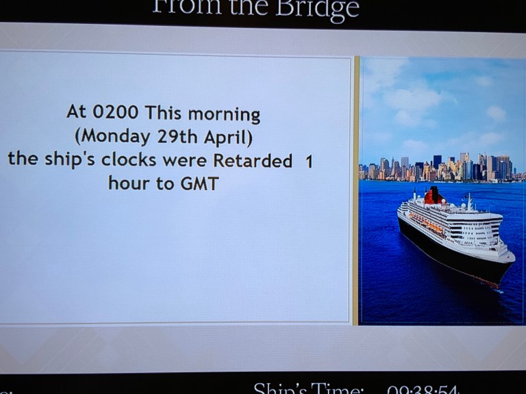 Whoa, just after I write this we have another medical evacuation. The ship has to turn back towards England, the Coast Guard helicopter rendezvous happens at 10 AM the floor above us. Interesting chart of our voyage!